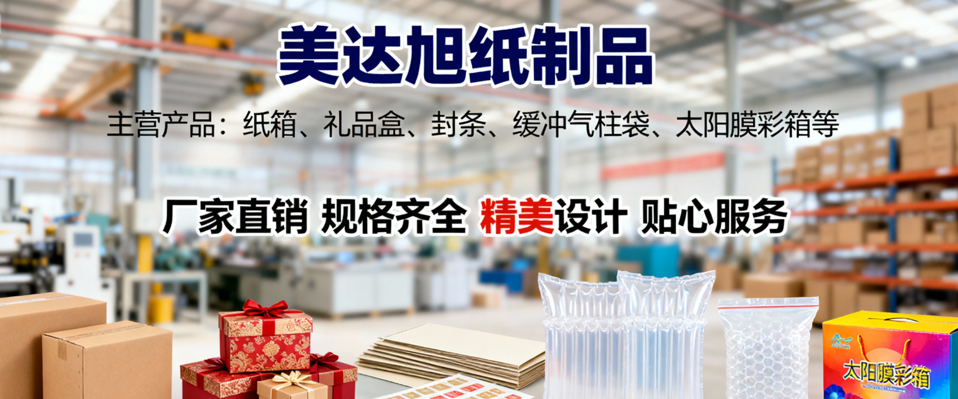 • 美達(dá)旭紙制品為客戶(hù)提供紙箱、禮品盒、太陽(yáng)膜彩箱、設(shè)計(jì)、生產(chǎn)、銷(xiāo)售、售后服務(wù)為一體的一站式解決方案!